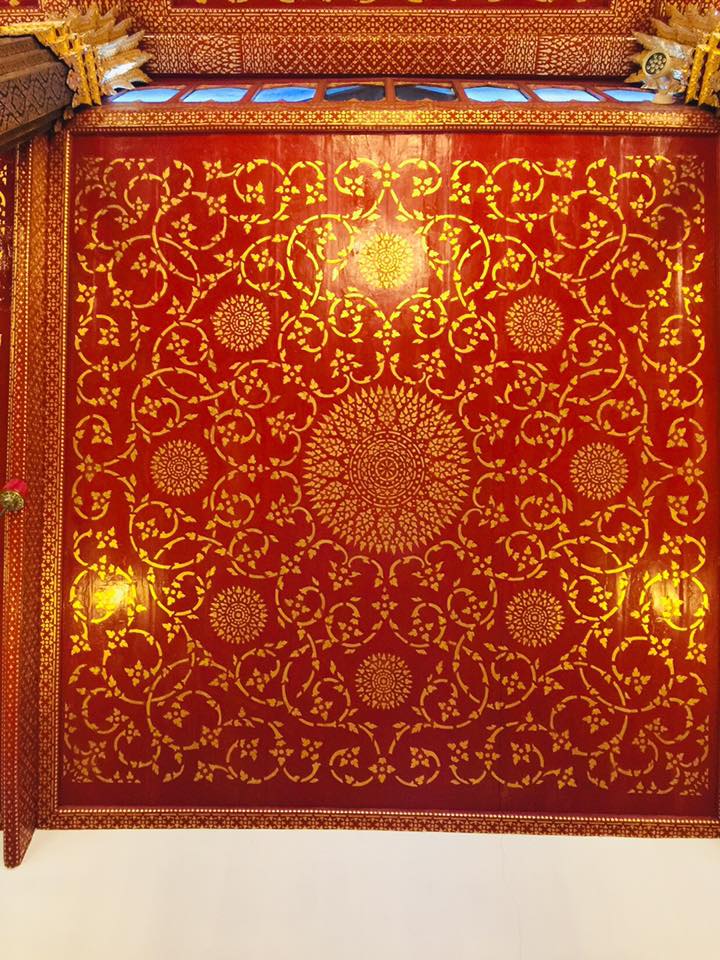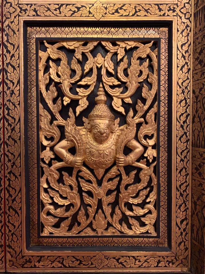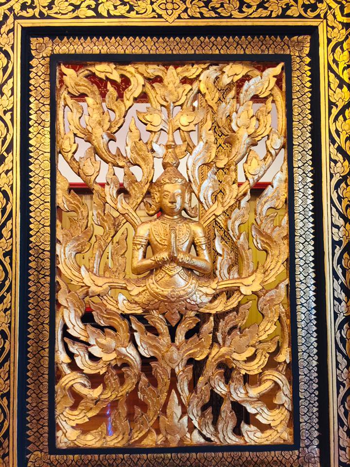 หน้าบันทั้ง ๔ ด้านตกแต่งด้วยลวดลายจำหลัก/ประดับกระจก เช่น หน้าบันทิศเหนือสลักเรื่องพระโพธิสัตว์สิทธัตถะตัดสินพระทัยออกผนวช เป็นต้น